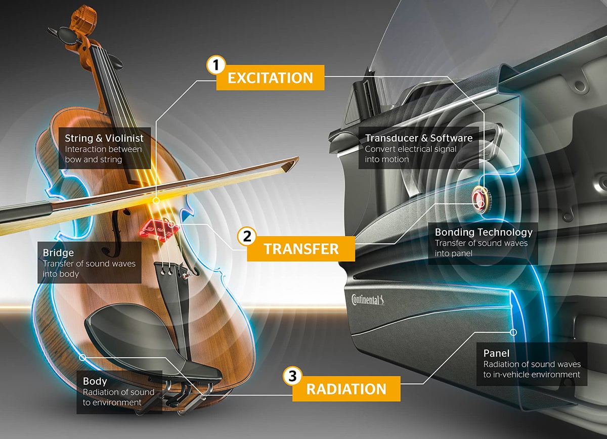Inspired by the way string instruments work, CES has reinvented automotive audio from the ground up. With our speakerless 3D audio system, Ac2ated sound, conventional speakers are replaced by actuators that generate sound by making surfaces vibrate.